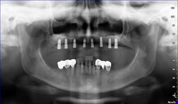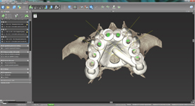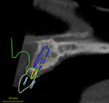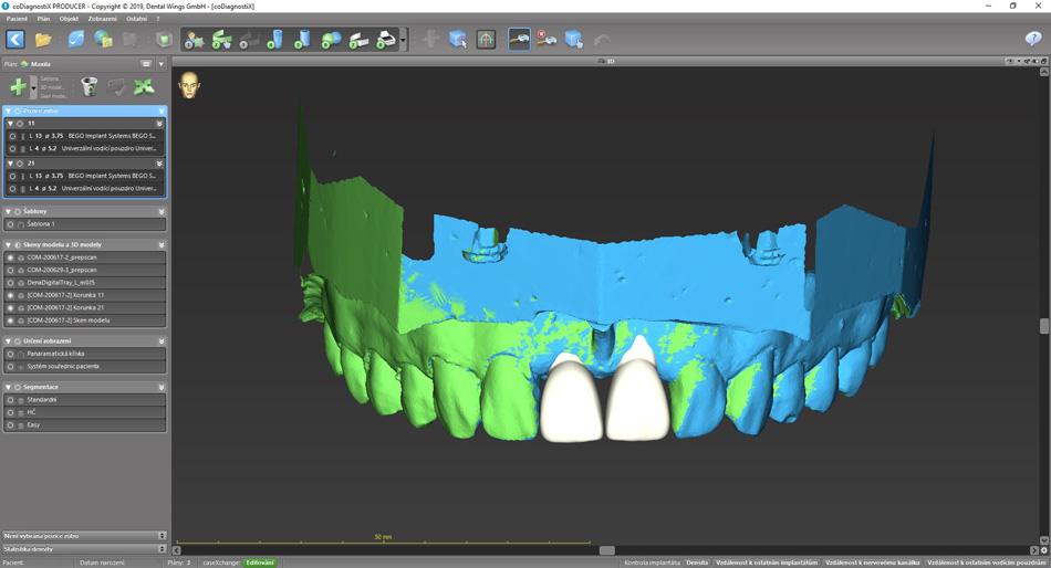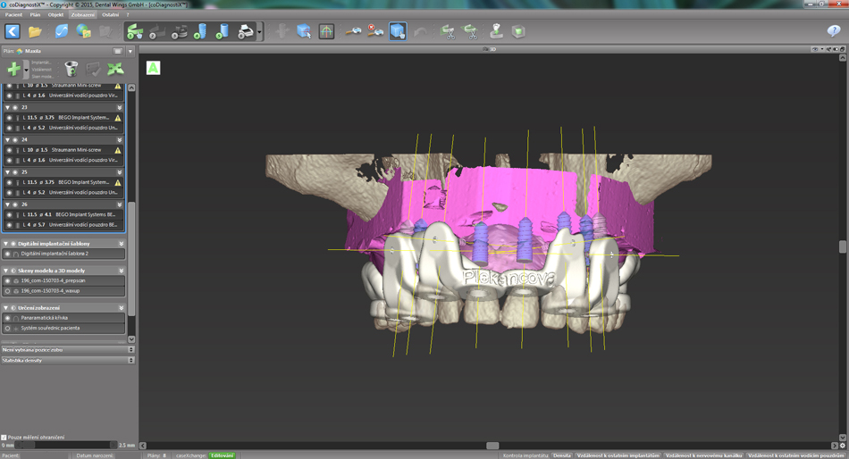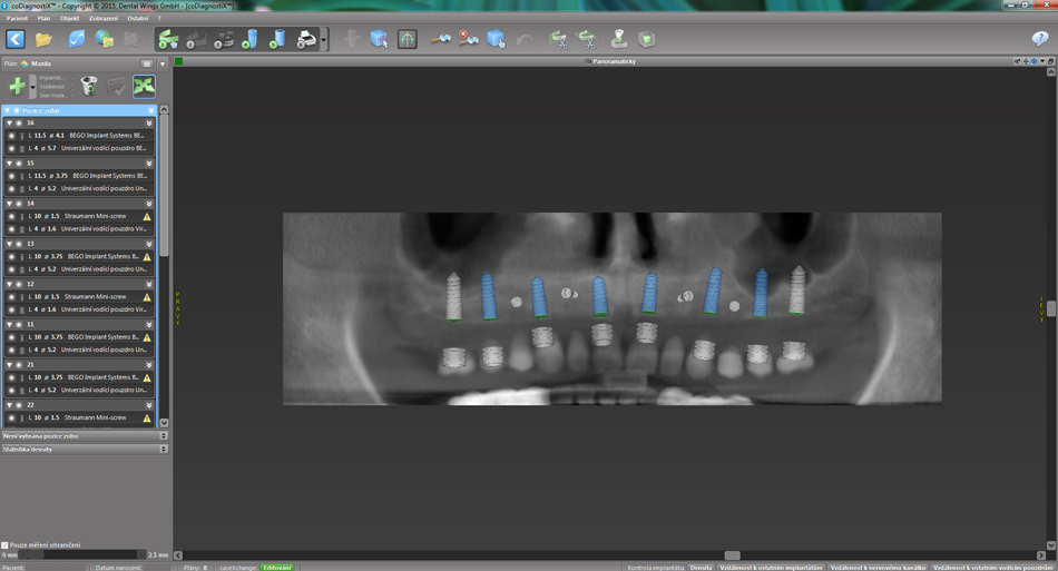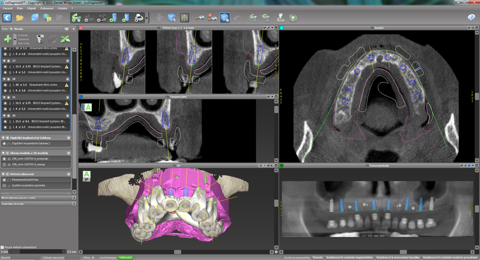 Vidí zde i důležité anatomické útvary – čelistní dutinu, průběh nervu atd. Po proměření množství kosti – šířky i výšky vybere z databáze vhodný typ implantátu a umístí ho do požadované lokality. Ihned vidí jeho pozici ve všech 3 rovinách a na všech snímcích i 3D modelu. Může upravovat podle potřeby jeho pozici, sklon atd.