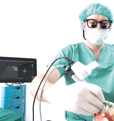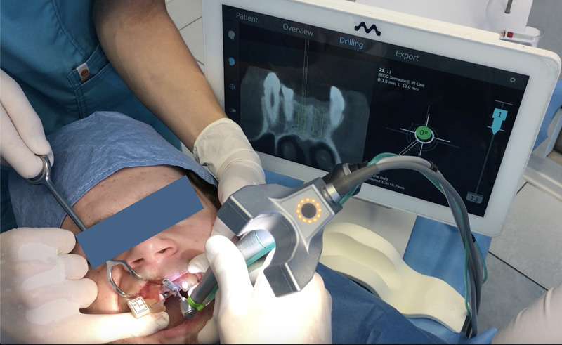 Zubní implantát, tedy v podstatě umělý zubní kořen, se zavádí do čelistní kosti a díky speciálně upravenému povrchu implantátu po určité době pevně přilne ke kosti. Tím dojde ke „vhojení implantátu“ (používá se označení osseointegrace), který se stane pevnou součástí kosti a je připraven k zatížení korunkou. Pro úspěšnou osseintegraci je však nutné přesné umístění implantátu do čelistní kosti, proto by mělo vždy každému zavedení implantátu předcházet dokonalé klinické a 3D rentgenologické vyšetření. Na základě těchto vyšetření je ve spolupráci se zubní laboratoří zhotoven finální chirurgický i protetický plán ošetření. Tento plán zahrnuje přesnou pozici, plánovanou hloubku i sklon implantátů a zhotovení chirurgické šablony pro řízenou nebo navigovanou implantaci pro perfektní finální funkční i estetický výsledek. Navigovaná/řízená implantologie operatérovi pomáhá vedením vrtáčku do kosti do přesné pozice, aby nedošlo k poranění pacienta, nepředvídatelným komplikacím nebo zavedení do nesprávné pozice. Naše pracoviště se díky bohatým zkušenostem specializuje za implantace pomocí navigace (aktivní/pasivní) již od roku 2014, kdy postupně testujeme jednotlivé systémy a materiály, které se objevují na trhu. Působíme jako vývojové, referenční a výukové pracoviště. Na vývoji a studiích přesnosti spolupracujeme s Ludwig Maximilian University of Munich (LMU), University for Digital Technologies in Medicine and Dentistry (DTMD) Luxembourg, DSI HUBER Dental Science & Innovation in Munich, Mininavident AG in Basel, CH