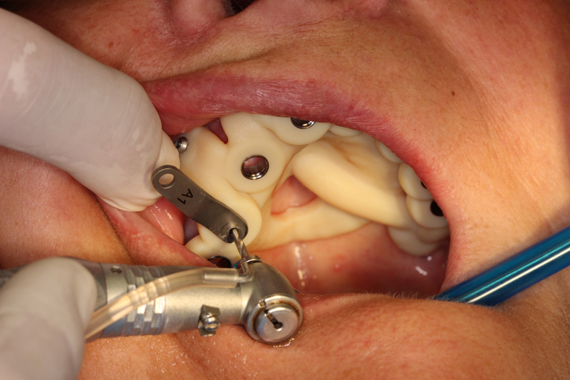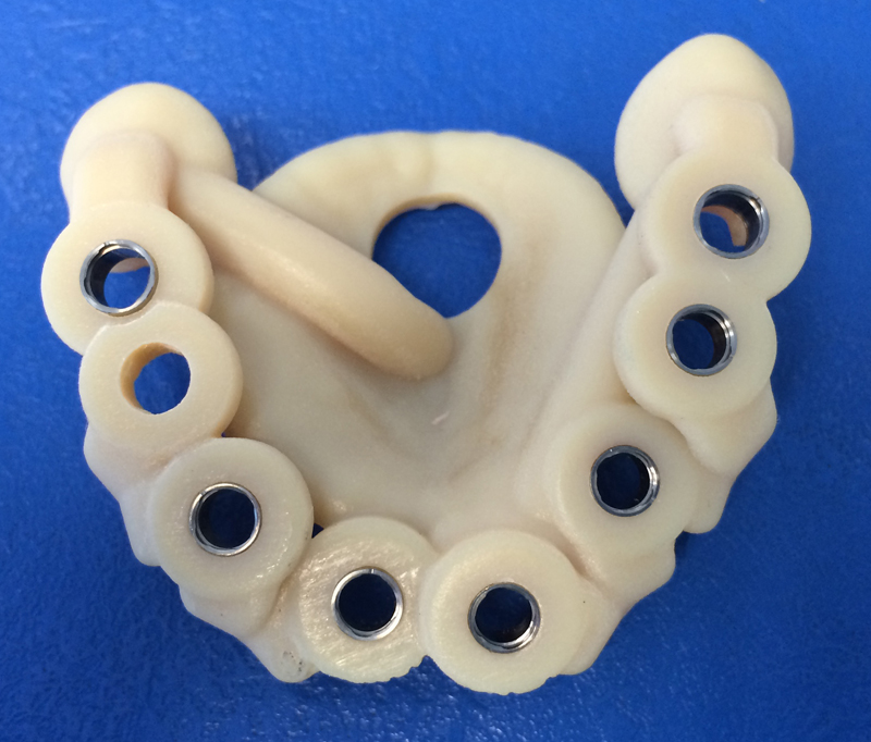 Principem řízené navigace pomocí chirurgických šablon je pasivní vedení zahlubovacích a rozšiřovacích vrtáčků do čelistní kosti na základě předem naplánované přesné pozice, směru, sklonu a hloubce jednoho nebo více implantátů. Chirurgicko-protetický plán vychází z 3D rentgenu čelisti, otisku zubů a dásně (scanu zubů a dásně) a finálního návrhu protetické náhrady. Na základě těchto dat je v plánovacím softwaru coDiagnostiX vytvořena chirurgická šablona, která je následně vytištěna na 3D tiskárně a použitá v den výkonu. Od roku 2014 jsme tuto metodu jako první v ČR začali využívat a nadále se podílíme na vývoji a vylepšování chirurgických šablon pro ještě přesnější a předvídatelnější výsledky.